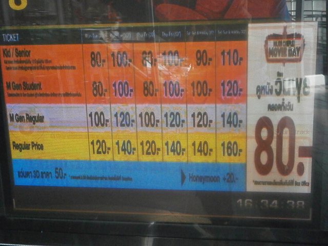 平日昼間なら一人100バーツくらいから。映画デーなら80バーツなんてことも。