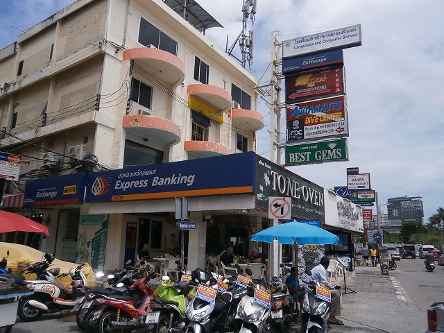 北パタヤ方面の場合は、逆にビーチロードまで出て、ソンテウ一本。バンコク銀行の両替所が目印。「