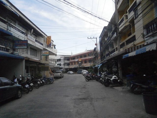 昼間の写真。ピンクのタイ文字が書いている店。夜になると、女性たちが表に出てくる。