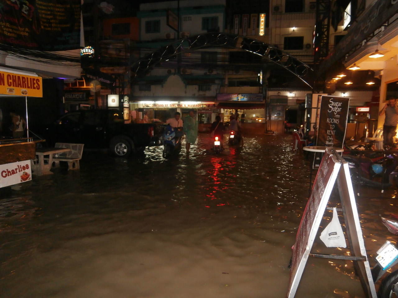 ビーチロードとセカンドロードにかけては、ここ数年排水溝工事が行われており、水はけが少しはマシになったようだが、パタヤ全体では、まだまだの様子。