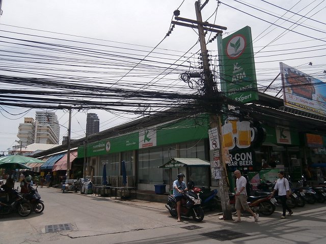 ブッカオ側の入り口は、カシコーン銀行が目印。銀行の隣はテスコロータス。裏手には、バービア群「R-CON BAR BEER」。